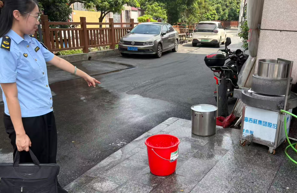 联合水务部门对镇内多路段餐饮单位开展联合检查,重点核查厨房是否按规定安装隔油池(或油水分离器),洗碗池、洗菜池排水管是否合理安装防止污水外溢形成积水。对于发现直接在路边清洗餐具用品或倾倒污水、未能提供“排水证”的商家,执法人员现场记录勘验笔录,责令整改并依法予以警告。